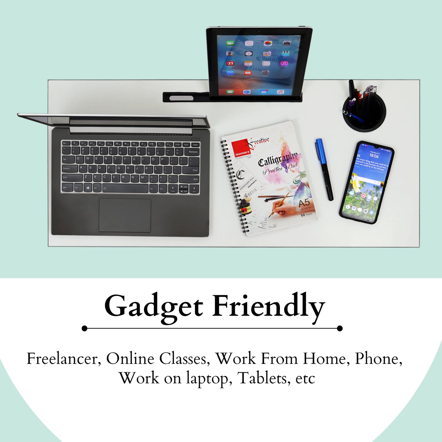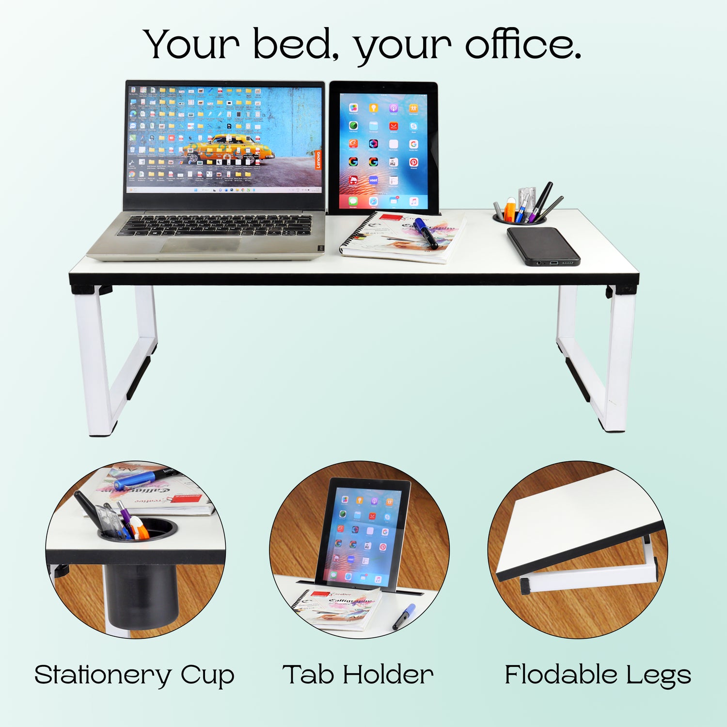 - The large table-top size facilitates you to keep laptop, mobile phone, cards, notebook, stationery instruments, coffee, ipad/tablets on one table.