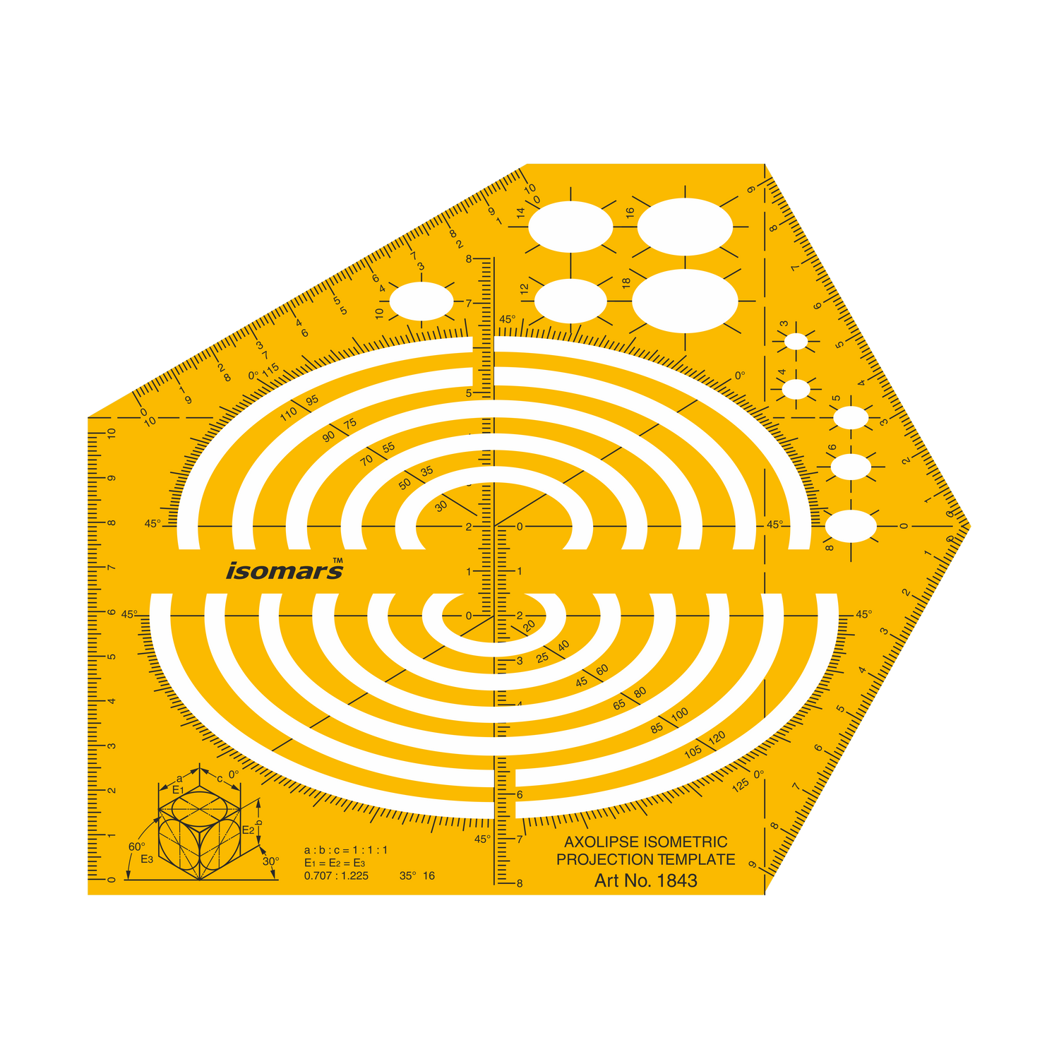 Elevate your technical drawing capabilities with the Isomars Axolipse Isometric Projection Template, an essential tool for engineers, architects, and technical illustrators. This precision-engineered stencil features comprehensive measurement scales and carefully calibrated curves for creating accurate isometric projections. The template includes multiple circular guides, angular measurements from 0 to 120 degrees, and detailed grid markings for precise dimensional control. Crafted in high-visibility yellow for easy reading, this professional-grade template helps you achieve perfect isometric drawings with consistent 30-degree angles and proportionate measurements. The template incorporates specialised ellipse guides and standardised measurement ratios (a:b:c = 1:1:1), making it invaluable for technical documentation, engineering designs, and architectural visualisations. Its durable construction ensures long-lasting performance while maintaining accuracy in your technical drawings.
