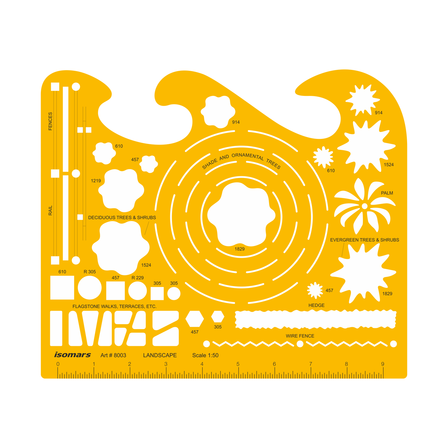 Transform your landscape design projects with the Isomars Landscape Design Template. This professional-grade stencil, scaled at 1:50, is an essential tool for architects, designers, and students. The template features a comprehensive array of landscape elements including deciduous and evergreen trees, shrubs, palms, and ornamental designs. Perfect for creating detailed garden layouts, the stencil includes useful elements like flagstone walks, terraces, hedges, and wire fence patterns. The clear, precise cutouts allow for consistent and accurate drawing of landscape features. Made with durable material for long-lasting use, this template helps maintain professional standards in landscape architecture drawings. The organised layout and practical scale make it ideal for both preliminary sketches and final presentation drawings. Whether you're planning a small garden or a large outdoor space, this template streamlines your design process with its well-thought-out selection of commonly used landscape symbols.